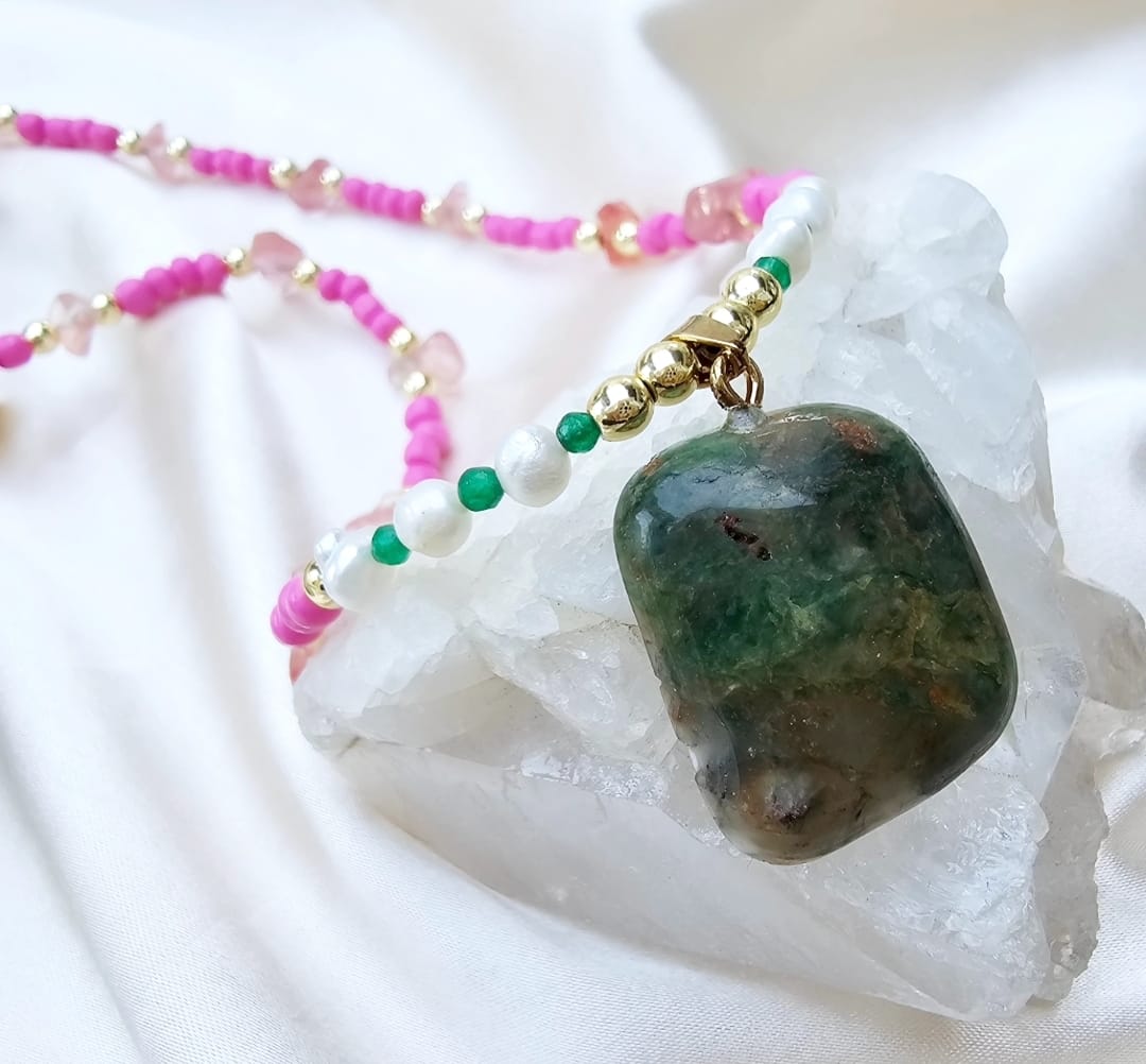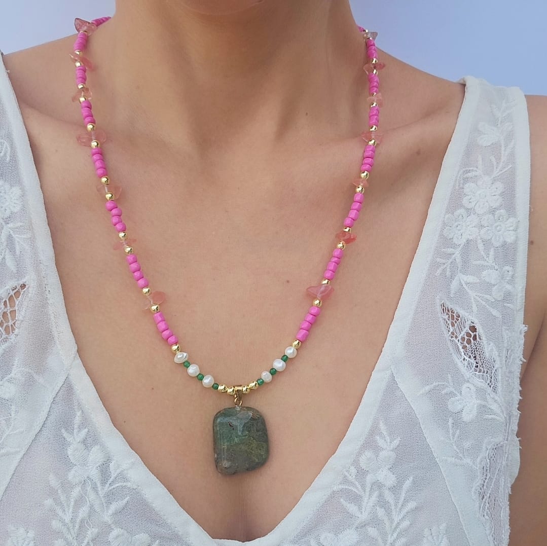 - Collar largo en chaquirón, cuarzo fresa y perla