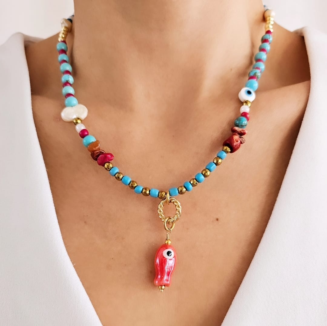 - Collar con chaquira calibrada, cuarzo blanco, cornalina